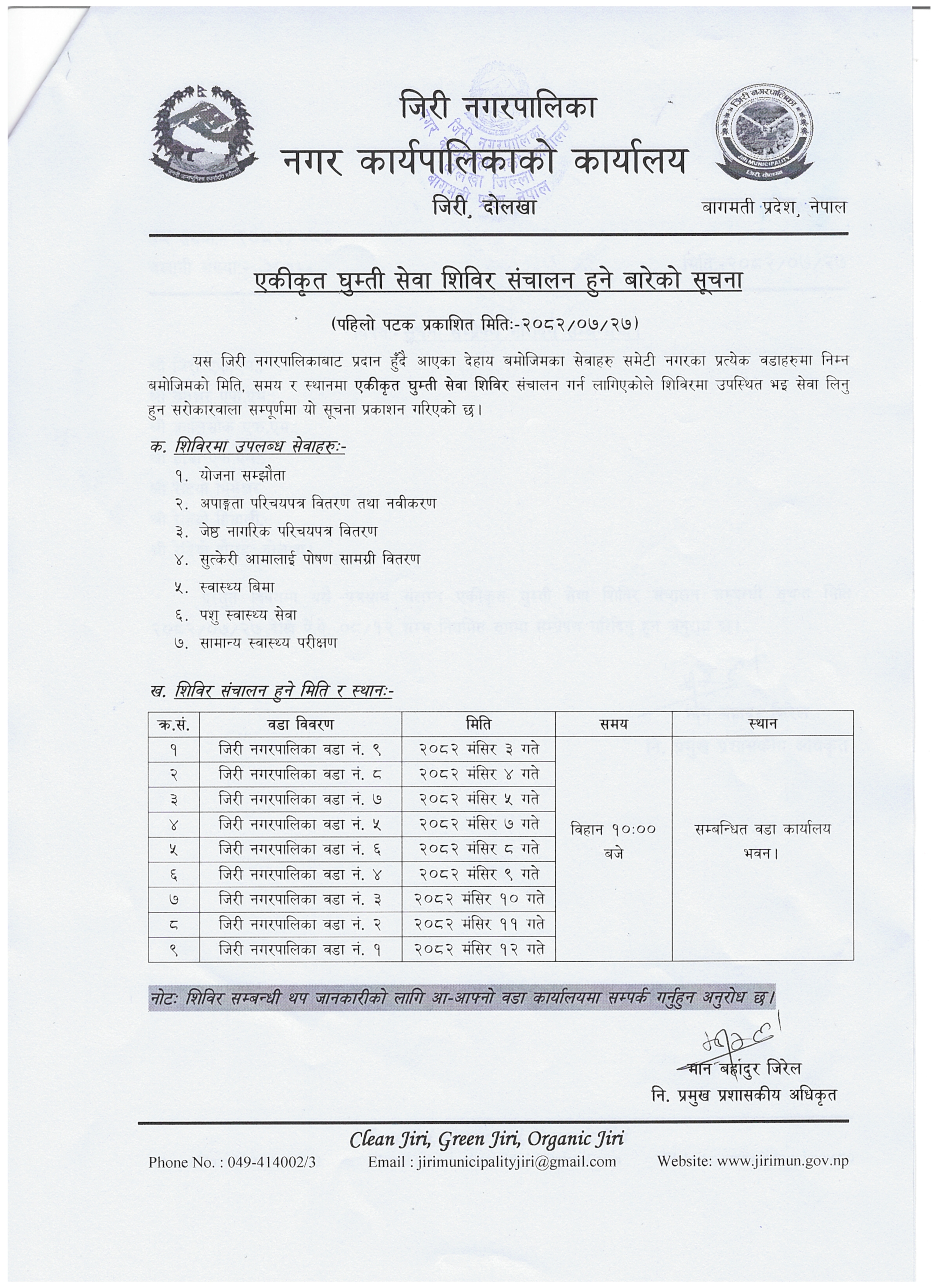 एकीकृत धुम्ती सेवा शिविर संचालन हुने बारेको सूचना ।