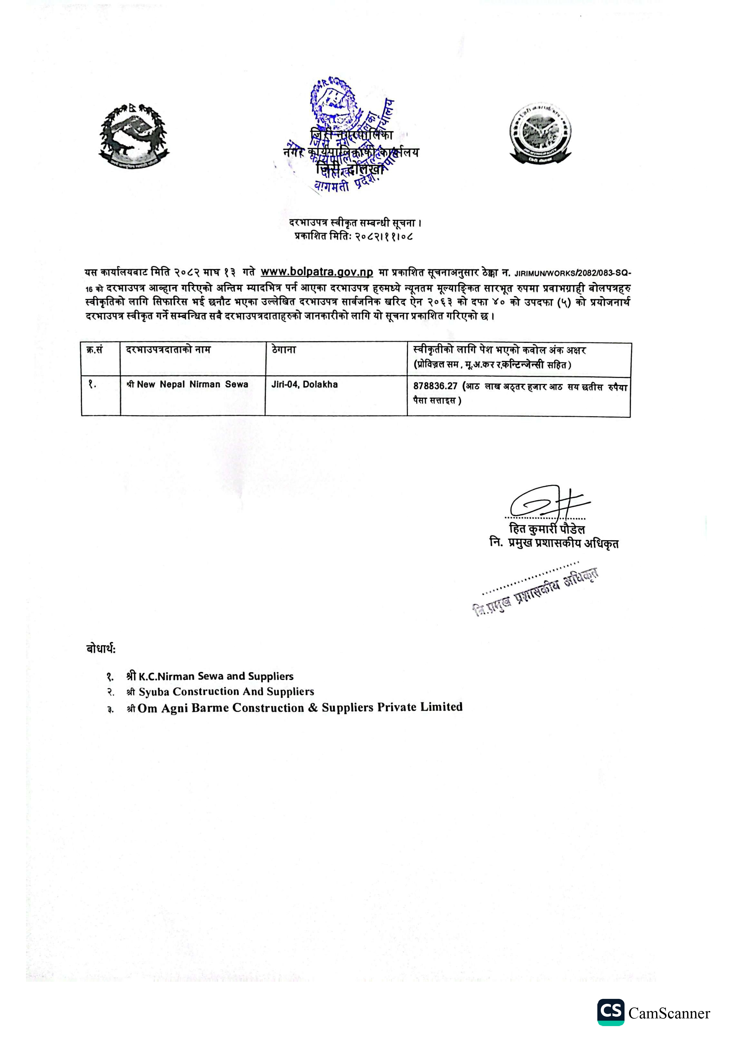 दरभाउपत्र स्वीकृत सम्बन्धी सूचना।